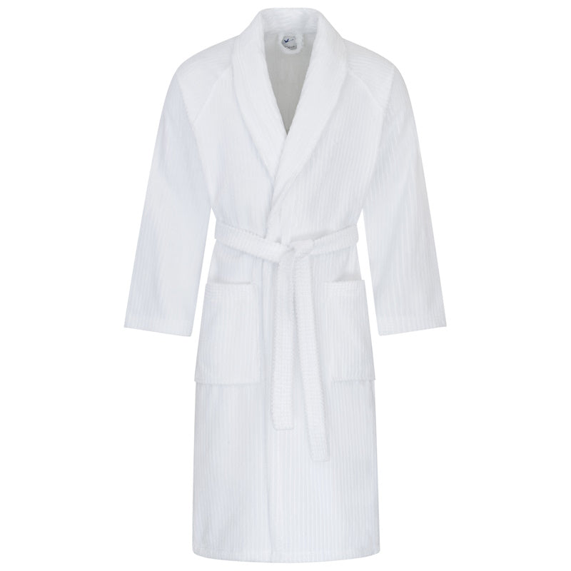 Weicher Bademantel in Veloursoptik mit Streifendesign sowie hautsympathischer Baumwolle innen, in mehreren Größen verfügbar. Standardmäßig in weiß verfügbar, auf Wunsch auch in anderen Farben. In jeder Variante komfortabel und schnell trocknend begeistert dieses einzigartige Design Hotelgäste rund um den Globus.